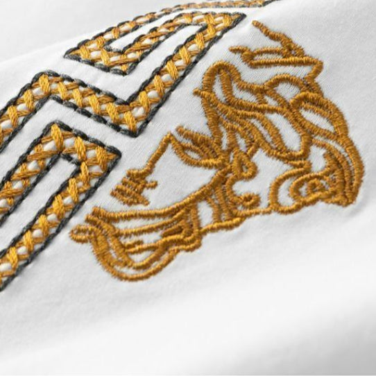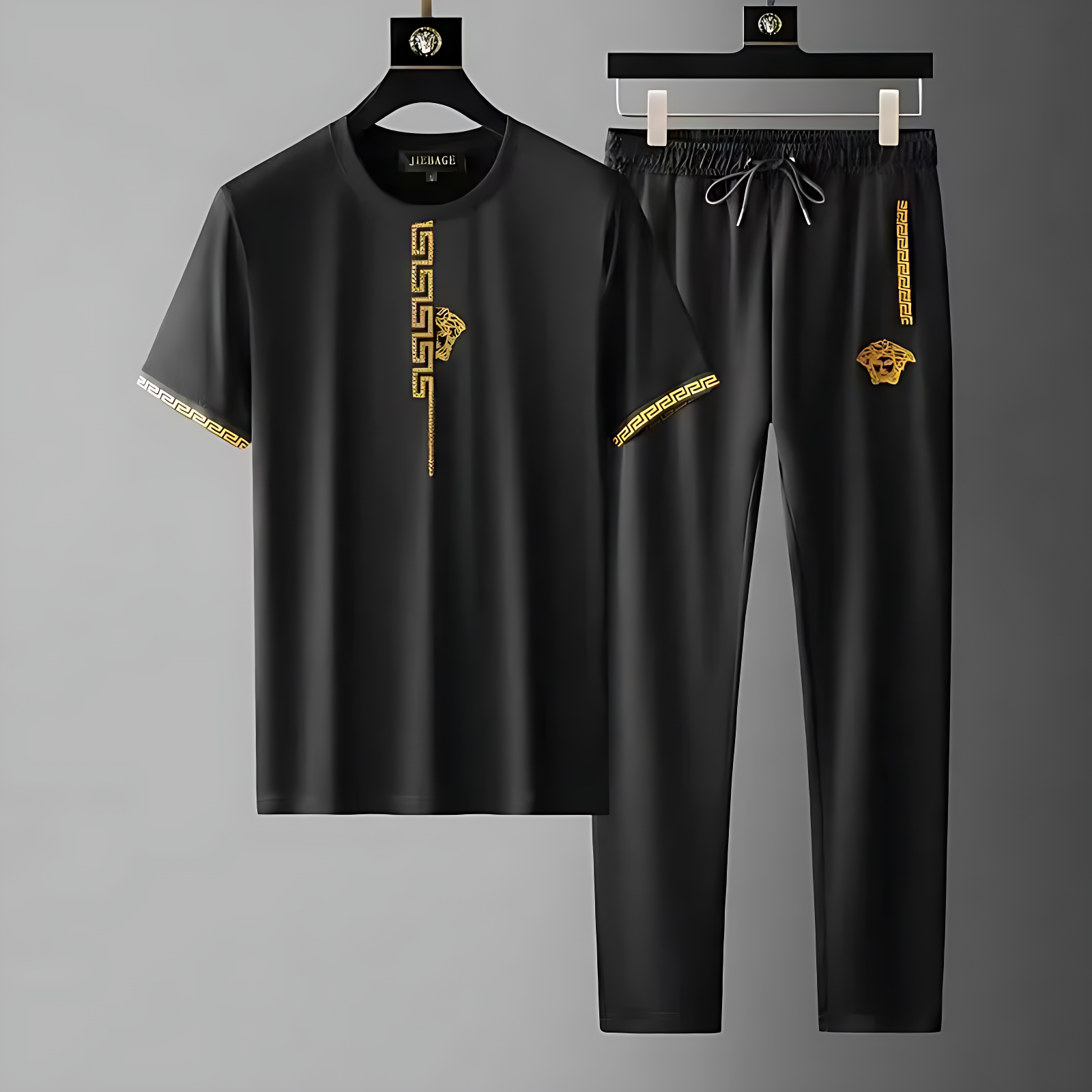 The Olympia Tracksuit Set blends luxury with edge, featuring bold gold embroidery and signature Greco trim. Its sleek silhouette and detailed accents make it a standout for modern streetwear style.