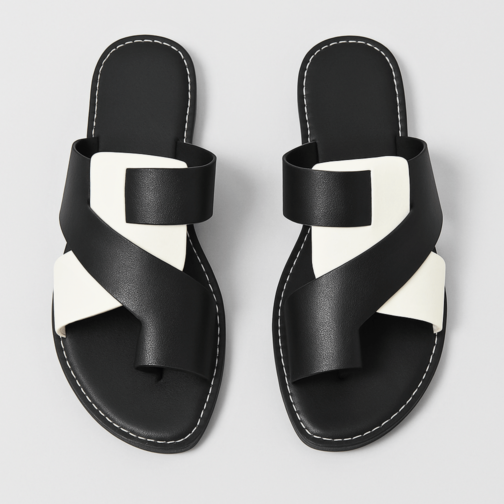 A modern twist on a timeless summer staple, featuring soft leather straps in a sleek criss-cross silhouette for a secure, flattering fit. The cushioned footbed delivers all-day comfort, while the two-tone design adds a polished, minimalist touch to every outfit.